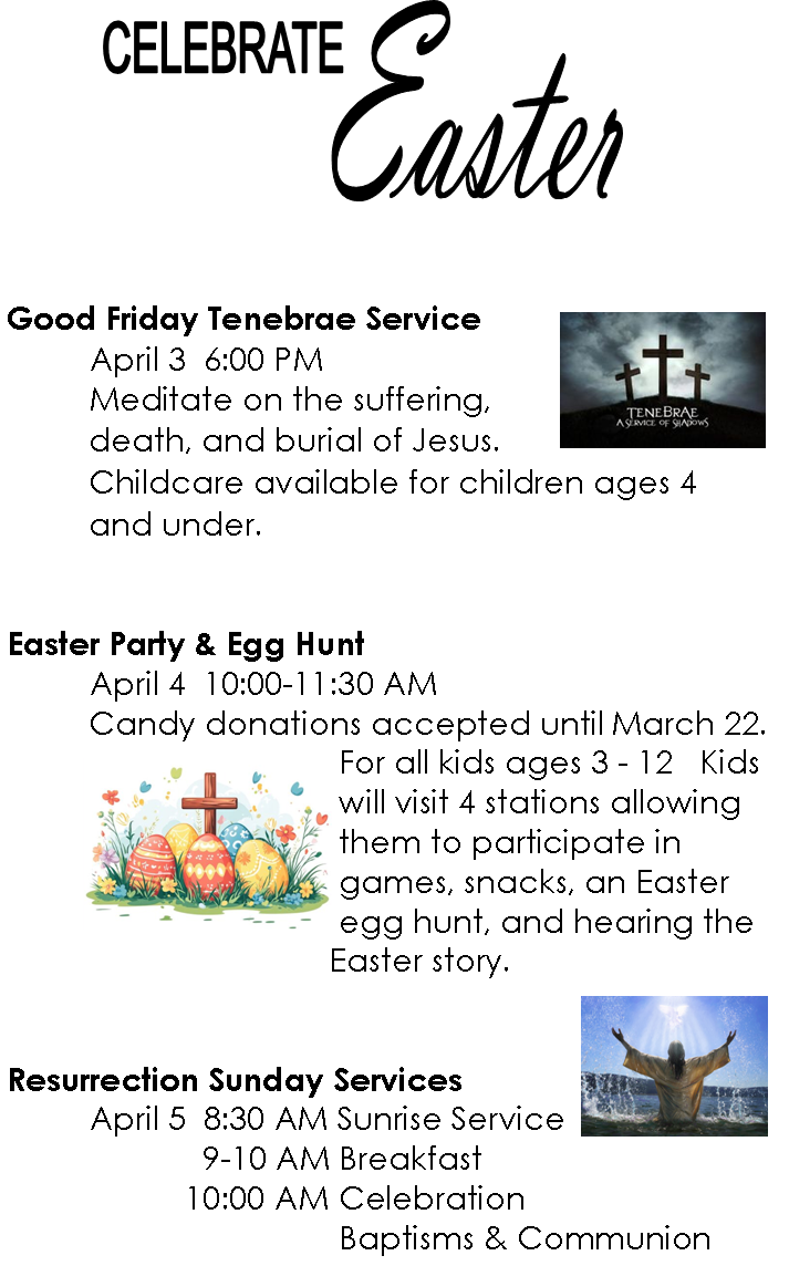 · Calling ladies of all ages! Let’s celebrate being sisters in Christ with a brunch on Saturday, May 2nd at 10AM with speaker/singer Lori Reighn Matta. Cost is $5 per lady and $3 for ages 12 and under. Please invite friends and neighbors. See Miranda Cowan or Amy Snyder to sign up.